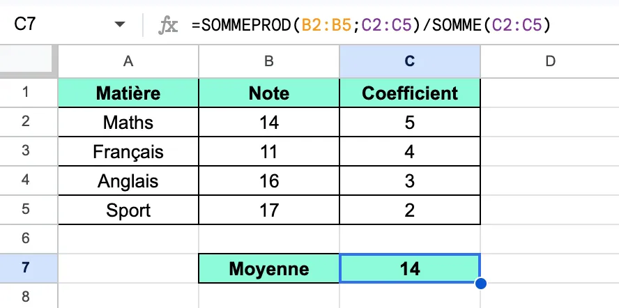 • SOMMEPROD(B2:B5;C2:C5) multiplie chaque valeur par son coefficient puis additionne les résultats. C’est l’équivalent des étapes 1 et 2 de notre calcul manuel.
